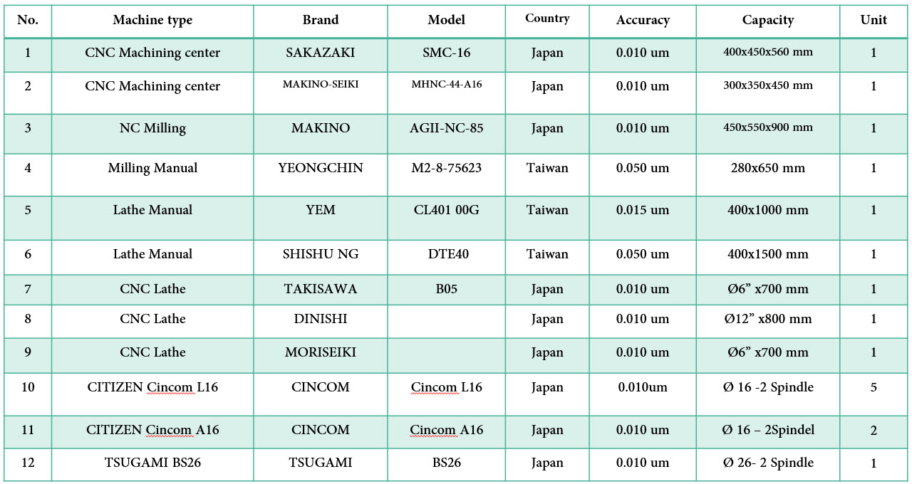 The company has 17 machines in the production line system, Factory to fabricate high precision (tolerance ± 0.010 um) and pane ship for contact support high technology. Capacity : Normally capability = 80 % : Spare capability = 20 %